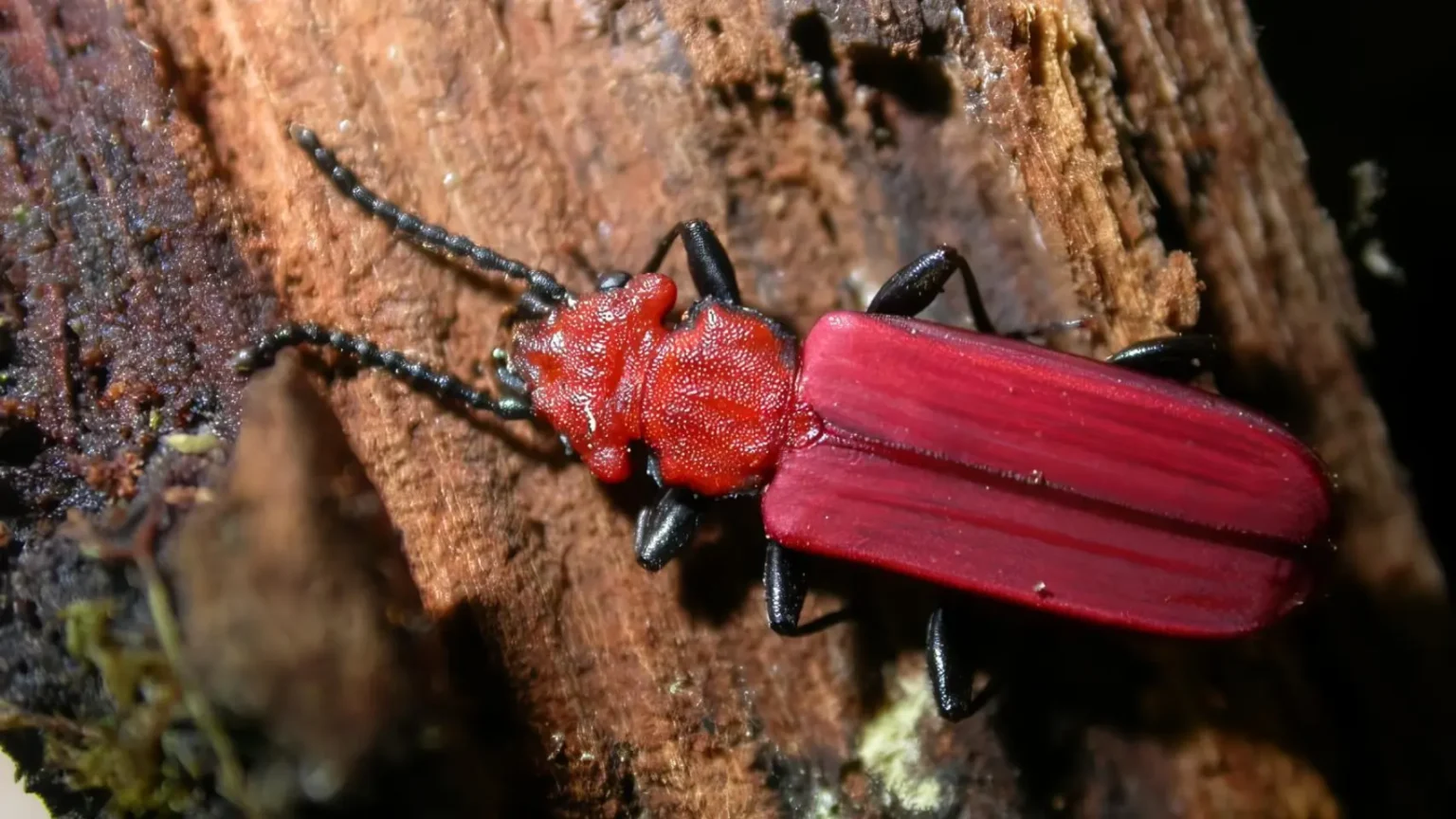 El Cucujus cinnaberinus no es un insecto cualquiera. Se trata de una especie saproxílica, lo que significa que depende de la madera muerta para sobrevivir.