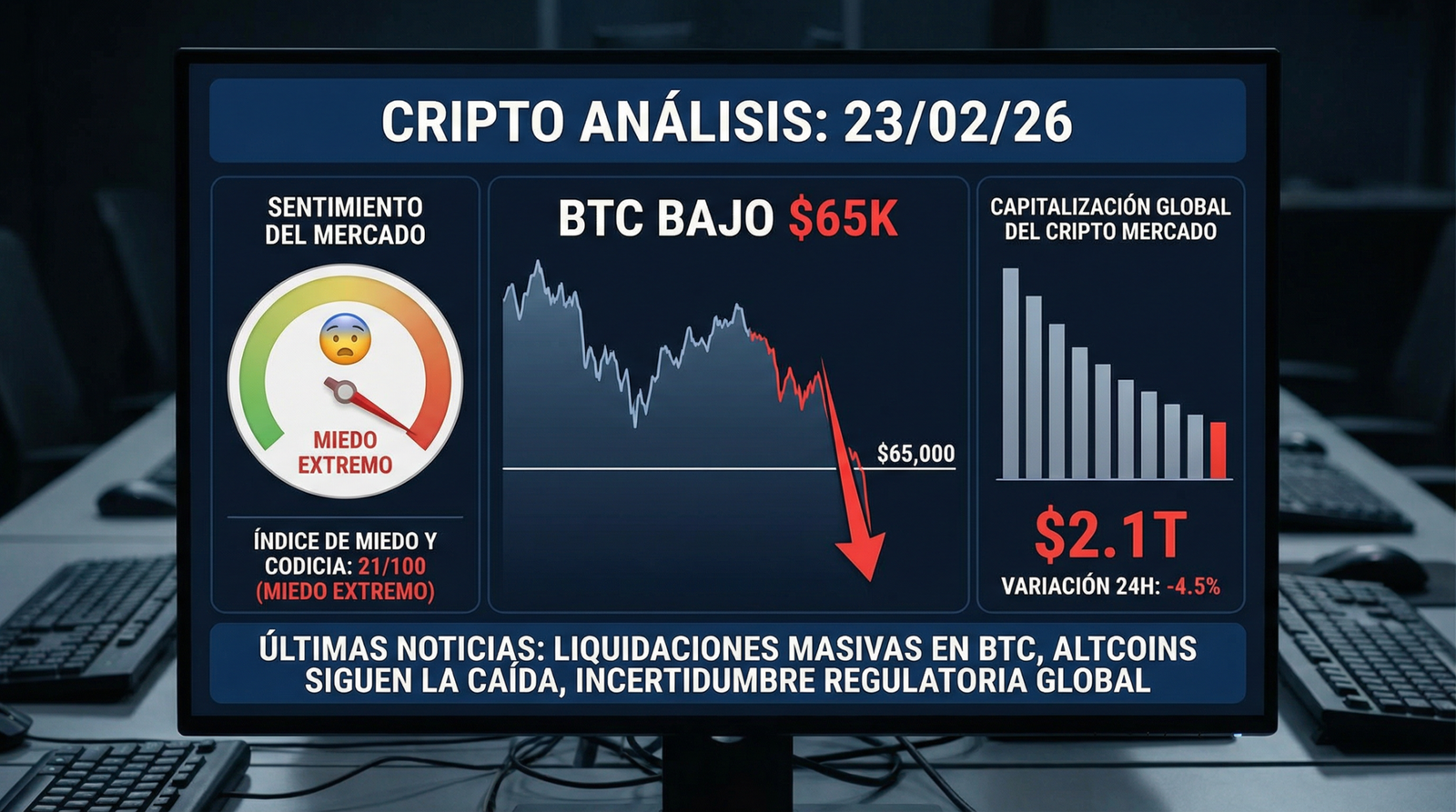 En el marco de Bitcoin Cripto 23/02/26, Bitcoin cayó más del 4.5% en las últimas 24 horas, perdiendo el nivel de $65,000 USD, un soporte técnico psicológico y técnico clave observado por analistas.