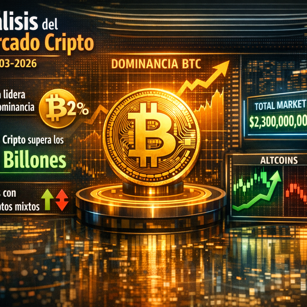 El mercado cripto 10-03-26 presenta una estructura dominada por Bitcoin. La capitalización total se sitúa ligeramente por encima de 2,3 billones de dólares, con un volumen diario superior a los 110.000 millones, lo que indica una actividad considerable tanto en exchanges centralizados como en protocolos DeFi.