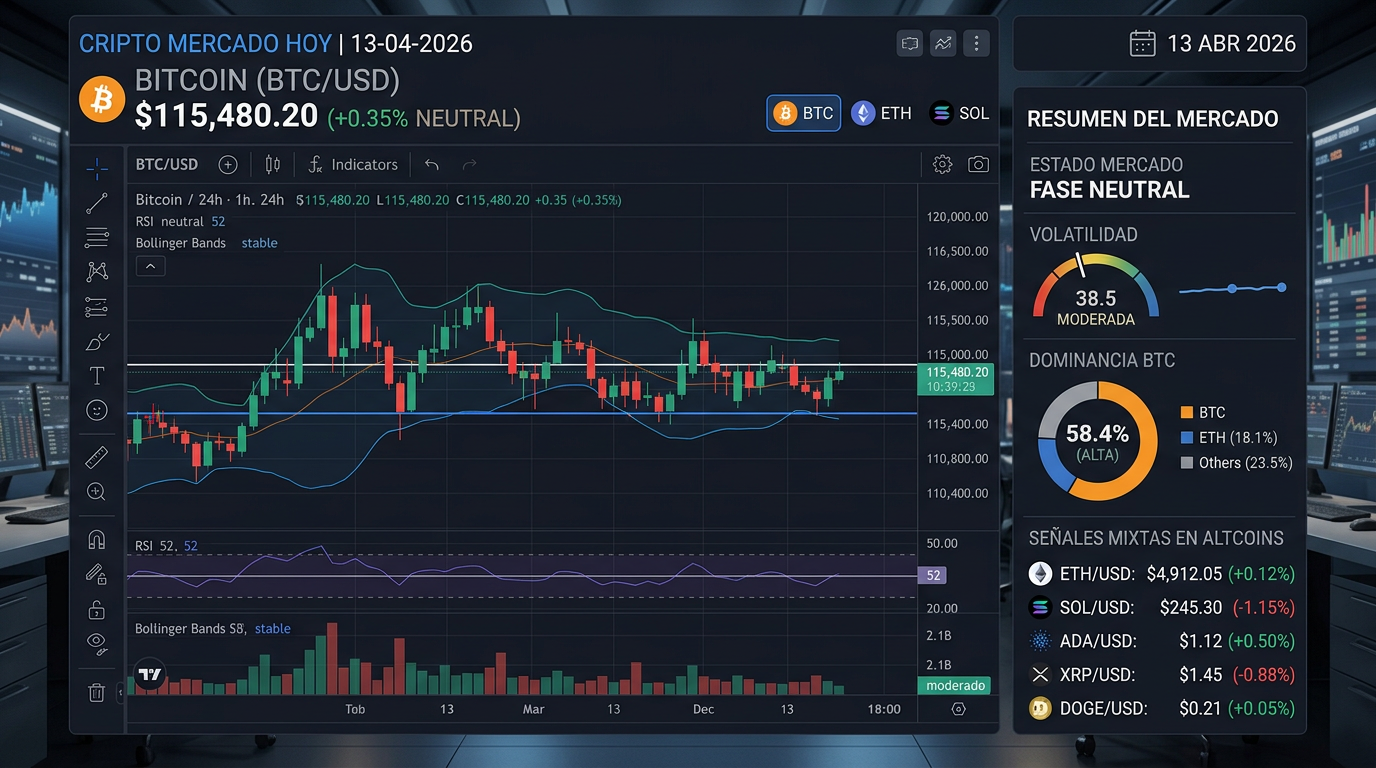 El mercado cripto en este 13 de abril de 2026 refleja un equilibrio entre optimismo moderado y cautela. Bitcoin hoy 13-04-26 actúa como eje central del ecosistema, manteniendo su dominancia y marcando el ritmo del resto del mercado.