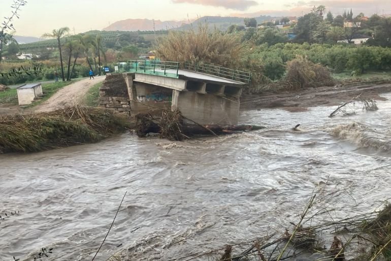 Uno de los ejemplos más visibles de los efectos del temporal ha sido el colapso de infraestructuras como el puente de Las Valencianas en Coín, completamente destruido.