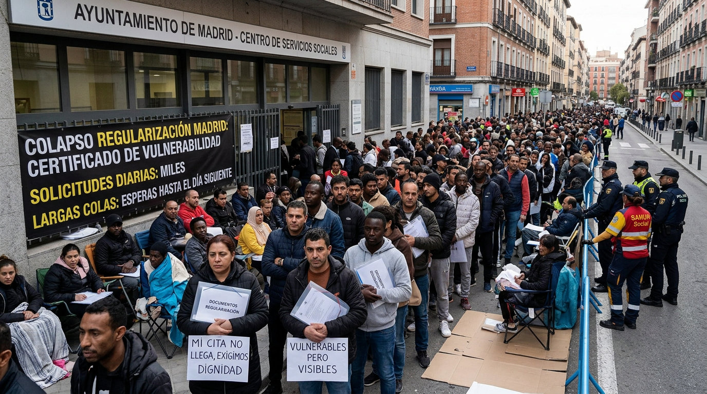 El colapso regularización Madrid ha desatado una situación crítica en los servicios sociales municipales, donde la avalancha de solicitudes está generando escenas inéditas de saturación y tensión. Desde la apertura del proceso para solicitar el certificado de vulnerabilidad, miles de personas han acudido a las oficinas, provocando largas colas, esperas de horas e incluso ciudadanos que pernoctan en las puertas para conseguir atención.