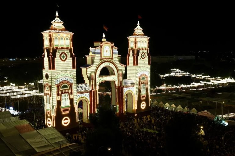 El lugar más icónico para vivir el Alumbrao es, sin duda, la propia Portada de la Feria de Abril de Sevilla.
