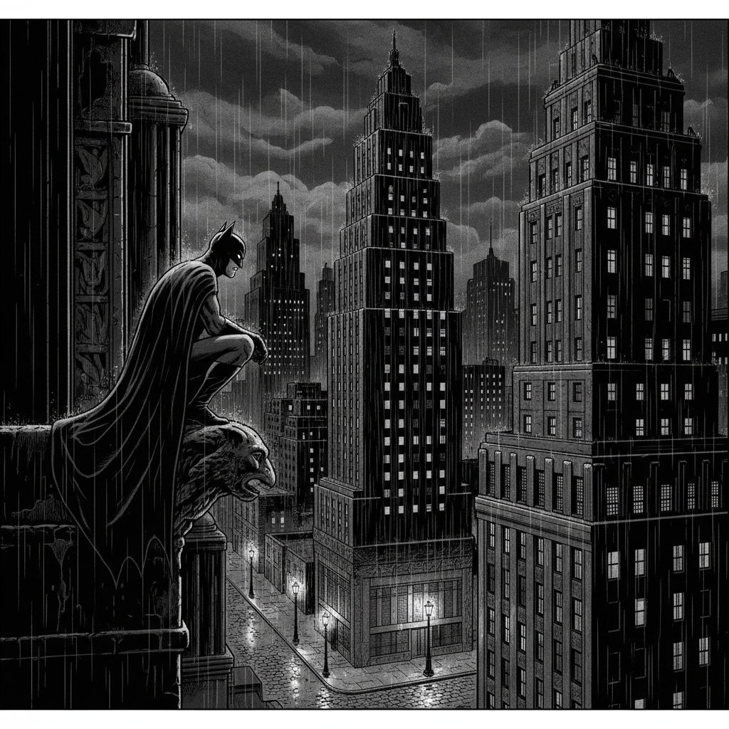 Este nuevo Batman presenta características estilísticas que tienen reminiscencias del cine clásico de terror, destacando detalles como las orejas de su capucha y su capa que refuerzan un aspecto sombrío. En esta narrativa, un Batman en sus inicios conocido como «el vigilante» se enfrenta a una serie de asesinos con un trasfondo misterioso, manteniendo una colaboración destacada con el Comisario Gordon, cuyo perfil se adapta a la temática de época.