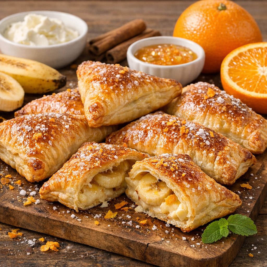 Las empanadillas hojaldradas de plátano, queso y naranja son un postre sencillo que combina el dulzor natural del plátano con la cremosidad del queso y el toque aromático de la naranja. Se preparan utilizando masa de hojaldre, lo que permite lograr una textura crujiente por fuera y un relleno suave y ligeramente fundente en el interior. Son ideales para una merienda rápida, para aprovechar fruta madura o para improvisar un dulce casero con pocos ingredientes. En menos de 30 minutos puedes tener listas unas empanadillas doradas, fragantes y perfectas para servir templadas.
