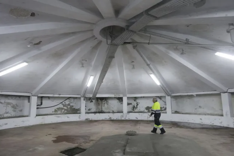 Lejos de la típica imagen de tuberías caóticas y maquinaria desordenada, lo que se encuentra bajo la fuente es un espacio completamente diáfano de 16 metros de diámetro, cubierto por una gran bóveda circular. Sobre esta estructura descansan nada menos que 90.000 litros de agua en constante movimiento.