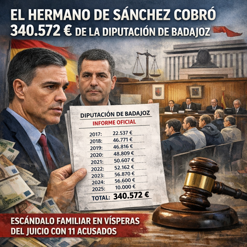 El hermano de Sánchez cobró un total de 340.572 euros de la Diputación de Badajoz entre julio de 2017 y mayo de 2025, según un documento oficial de la administración pacense. La cifra, desglosada año a año, sitúa en el centro del debate político y judicial al entorno familiar del presidente del Gobierno en vísperas de un juicio que contará con 11 acusados.
