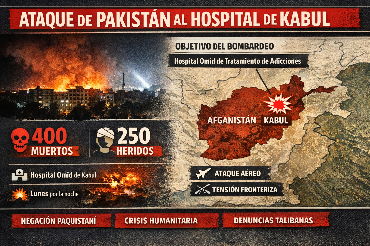 El devastador bombardeo del Ejército de Pakistán sobre el Hospital de Tratamiento de Adicciones Omid en Kabul ha dejado al menos 400 muertos y 250 heridos, según ha confirmado el Gobierno talibán. El ataque, ocurrido la noche del lunes, ha generado conmoción internacional y renovado la preocupación por la seguridad de los civiles en Afganistán, un país que sigue enfrentando la violencia en múltiples frentes.