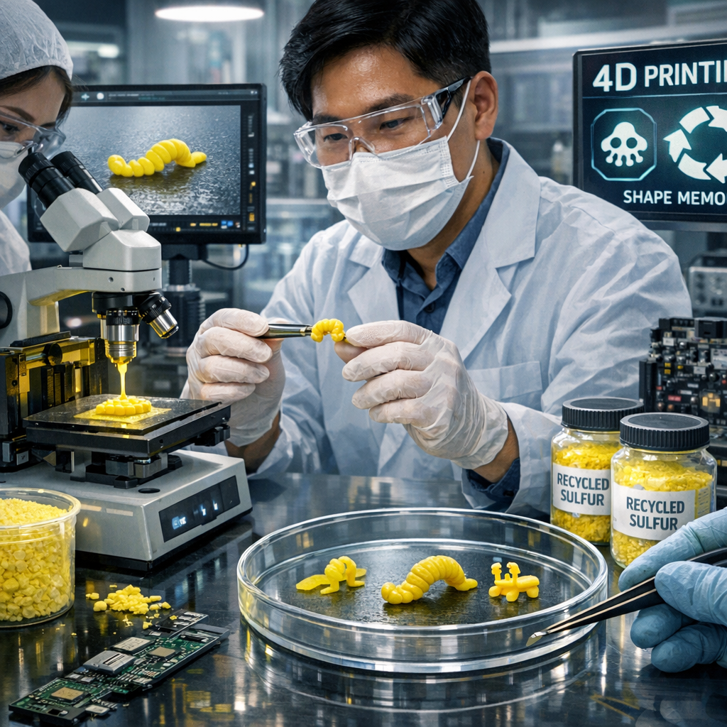 Investigadores surcoreanos han logrado un avance histórico en materiales avanzados al desarrollar la primera impresión 4D con azufre reciclado, capaz de crear robots blandos autónomos de menos de 1 cm que se mueven sin cables ni electrónica integrada. Esta innovación combina la economía circular con robótica inteligente, utilizando residuos industriales de azufre como materia prima.