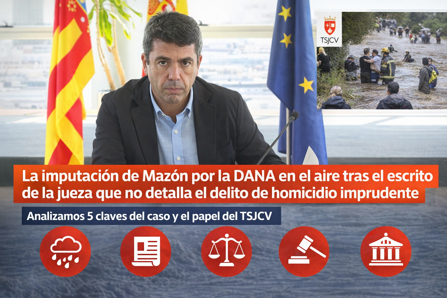La imputación de Mazón por la DANA en el aire marca un nuevo capítulo judicial en la investigación sobre la gestión de la catástrofe que dejó 230 fallecidos en la Comunidad Valenciana. La titular del Juzgado de Instrucción nº 3 de Catarroja ha elevado una exposición razonada al Tribunal Superior de Justicia de la Comunidad Valenciana (TSJCV), pero sin concretar de forma detallada el encaje del delito de homicidio imprudente.