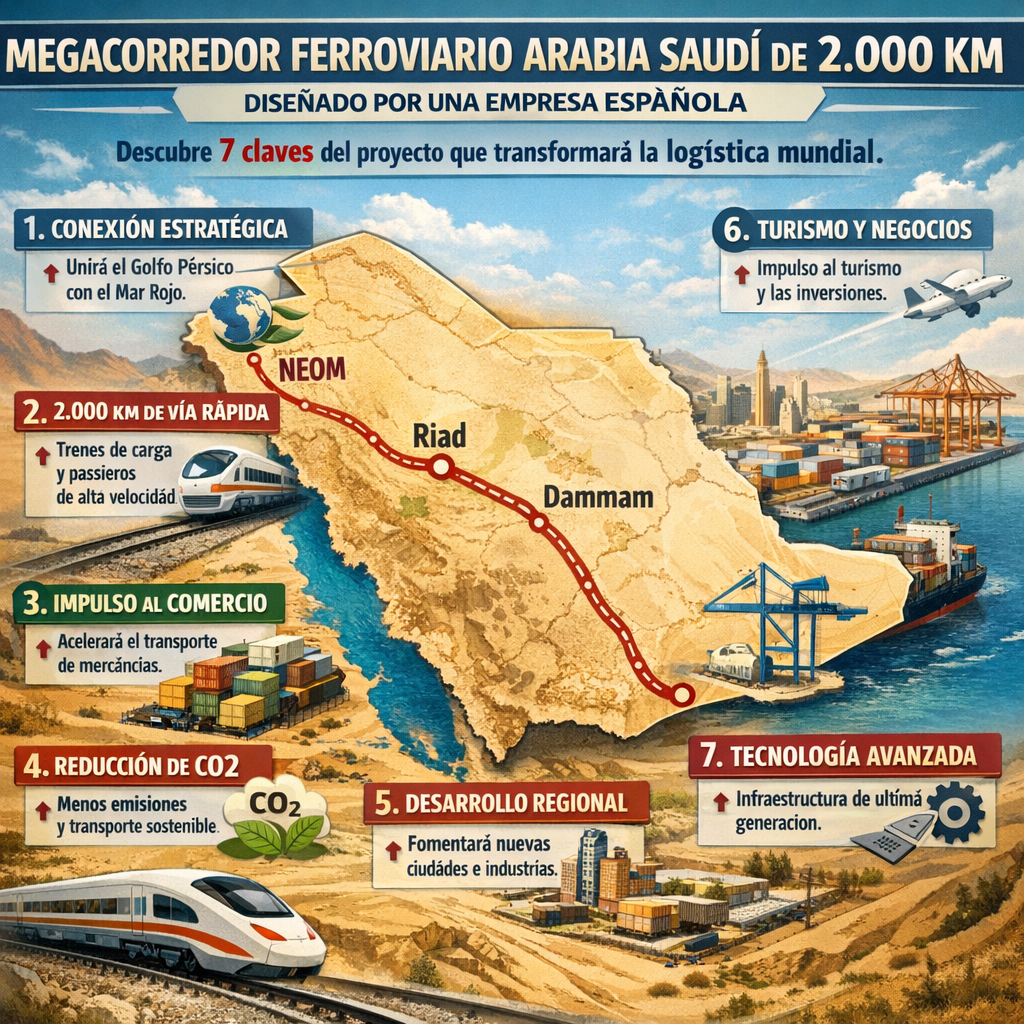 El megacorredor ferroviario Arabia Saudí representa una de las mayores apuestas de infraestructura del siglo XXI. Diseñado por una empresa española, combina innovación tecnológica, visión estratégica y una escala sin precedentes. Su impacto podría transformar no solo la logística del país, sino también el equilibrio del comercio global en las próximas décadas.