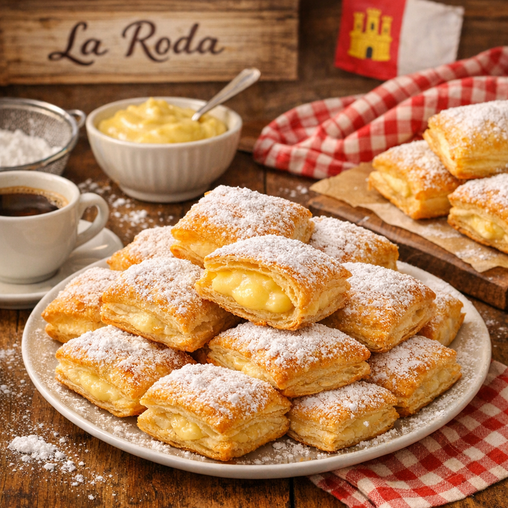 Los miguelitos de La Roda son pequeños bocados de hojaldre rellenos de crema pastelera y espolvoreados con azúcar glas, originarios del municipio albaceteño de La Roda. Esta receta reproduce la versión tradicional que se popularizó en las confiterías manchegas: ligera, crujiente y con un relleno suave que equilibra el dulzor del hojaldre. Es un postre perfecto para meriendas, celebraciones o para acompañar el café, porque se prepara con ingredientes sencillos y se puede hacer fácilmente en casa usando hojaldre ya preparado.