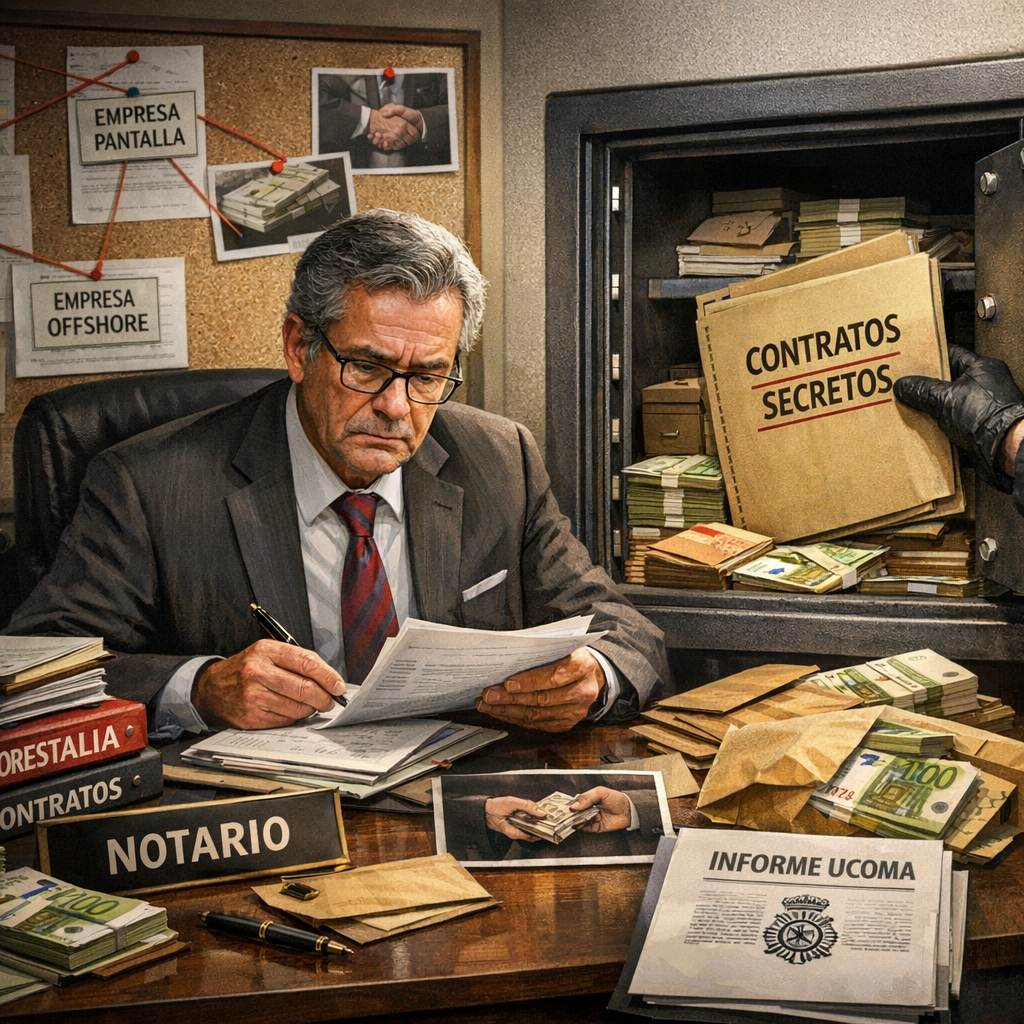 Uno de los aspectos más relevantes del caso es el rol del notario. La UCOMA sostiene que el notario del caso Forestalia escondió contratos en una caja fuerte por presunto blanqueo y que esta práctica podría encajar en una operativa destinada a ocultar movimientos económicos ilícitos.