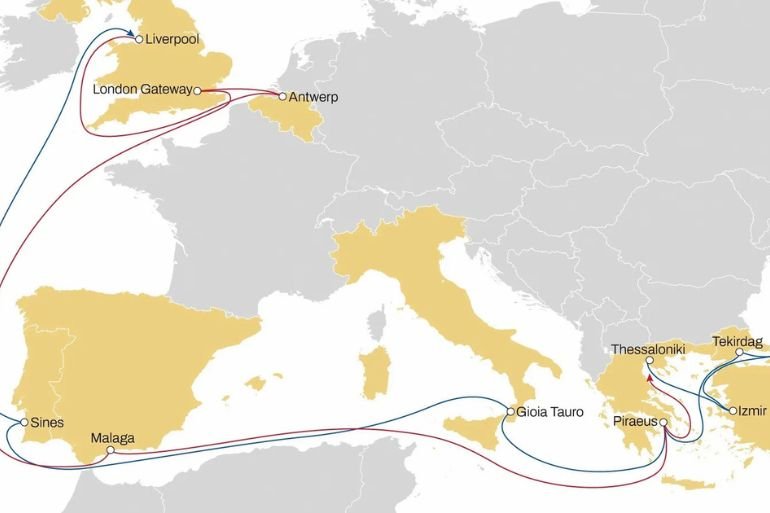 Desde ahí, la ruta continúa hacia el Mediterráneo oriental, con paradas en El Pireo y Tesalónica en Grecia, así como en ciudades turcas como Izmir, Tekirdag y Gebze.