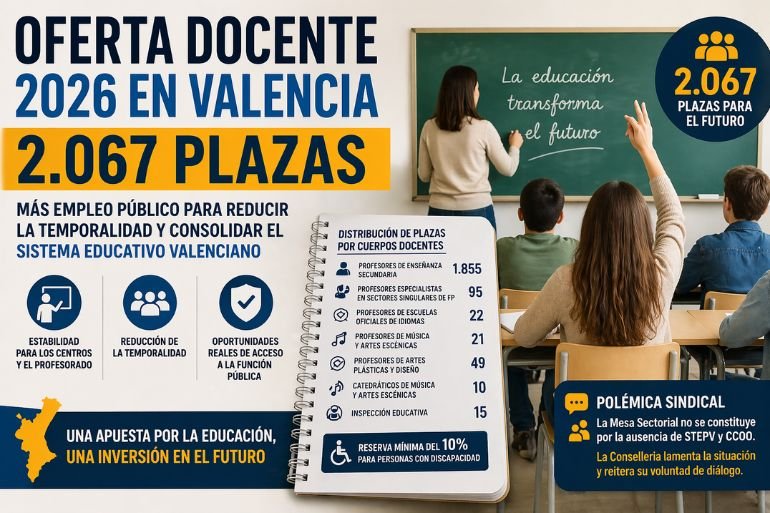 La Conselleria de Educación de la Comunitat Valenciana ha anunciado una oferta de empleo público docente para 2026 que alcanza las 2.067 plazas, una de las cifras más elevadas de los últimos años.
