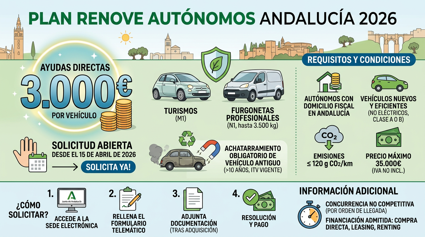 El Plan Renove autónomos Andalucía 2026 ayudas 3000 euros vehículos contempla ayudas directas de hasta 3.000 euros por beneficiario.