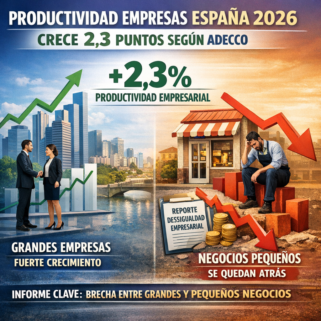 La productividad empresas España 2026 ha registrado un aumento global de 2,3 puntos, según el último V Barómetro Adecco Outsourcing en colaboración con el Centro Español de Logística. Sin embargo, este crecimiento no es homogéneo, ya que la mejora se concentra principalmente en las grandes compañías mientras los pequeños negocios se estancan o incluso retroceden.
