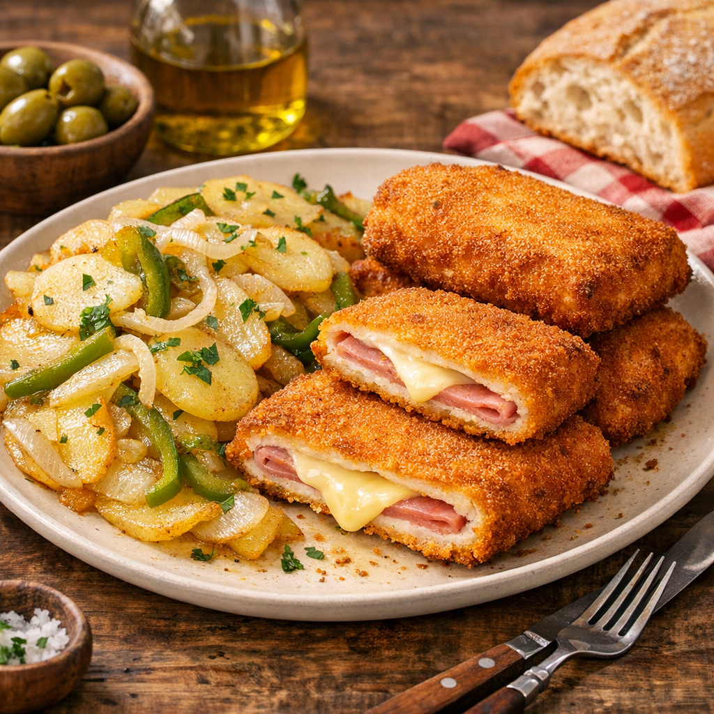 Los san jacobos con patatas a lo pobre son un plato clásico de cocina casera española que combina filetes rellenos de jamón y queso, empanados y fritos, con una guarnición de patatas tiernas cocinadas lentamente con cebolla y pimiento. Es una receta pensada para quienes buscan una comida contundente, económica y muy sabrosa, perfecta para fines de semana o comidas familiares. Funciona porque equilibra texturas —crujiente por fuera, fundente por dentro— con el sabor suave y reconfortante de las patatas.
