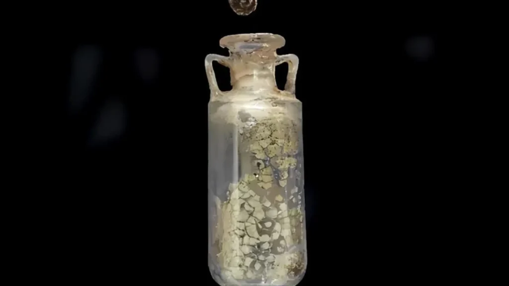 El recipiente analizado es un ungüentario, un pequeño frasco de vidrio utilizado en la antigua Imperio romano para almacenar perfumes, cosméticos o preparados medicinales.