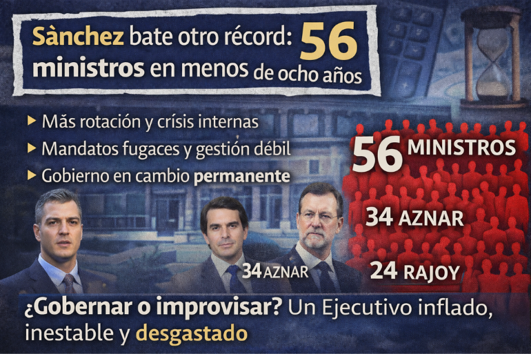 Sánchez ya puede presumir de otro récord. Pero no es uno que beneficie a España. Tener 56 ministros no demuestra amplitud ni dinamismo: demuestra volatilidad, debilidad estructural y una Moncloa convertida en máquina de rotación política.