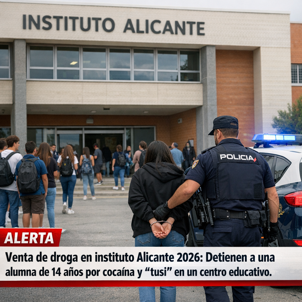 Venta de droga en instituto Alicante 2026 ha generado una fuerte conmoción en la comunidad educativa y en las autoridades tras la detención de una alumna de 14 años acusada de vender cocaína y tusi dentro de un instituto situado en la zona sur de Alicante. El caso, que ya está en manos de la Fiscalía de Menores, implica además a otros tres jóvenes en una operación policial que se inició hace semanas.